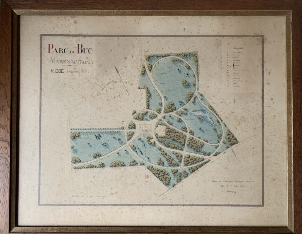 En même temps, Jean Boé fait préparer un projet d’aménagement d’un parc, par un architecte paysagiste d’Albi, couvrant 7 à 8 hectares et inséré au milieu des prés et des terres exploitées. C’est ce projet qui sera mis en œuvre, et à la fin de l’année 1894, la famille Boé emménage dans le château du Buc remis à neuf. Le temps des splendeurs commence alors au Buc, avec chevaux, voitures, bals et des visites incessantes.